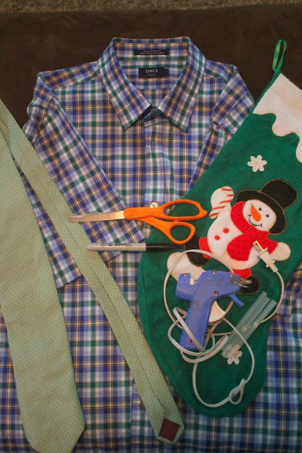 Take your tie and lay it inside the collar. Hot glue the inside so it cannot slide off or move - if you would like to also hot glue the long part down about 3 or 4 inches to the center of the stocking so it hangs straight when you display it.
